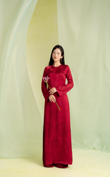 Họa tiết: người dáng cân đối có thể chọn họa tiết to hoặc nhỏ đều được, nhưng nên bố trí hài hòa – ví dụ hoa văn chạy dọc thân áo hoặc tập trung ở vai, ngực, tà dưới để tạo điểm nhấn. Nếu yêu thích sự tinh tế, áo dài trơn nhấn nhá bằng viền cổ, nơ eo hoặc đính ngọc trai cũng là lựa chọn sang trọng.