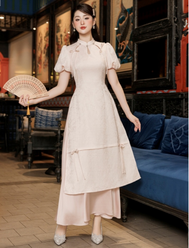 Chất liệu: có độ dày vừa phải và rủ nhẹ như lụa tơ tằm, gấm, nhung nhẹ hoặc satin cao cấp, vì những chất vải này giúp áo có độ phồng tự nhiên, tạo cảm giác thân hình không quá gầy gò. Nên tránh các loại vải quá mỏng hoặc ôm sát như chiffon hay voan vì chúng dễ làm lộ nhược điểm cơ thể.