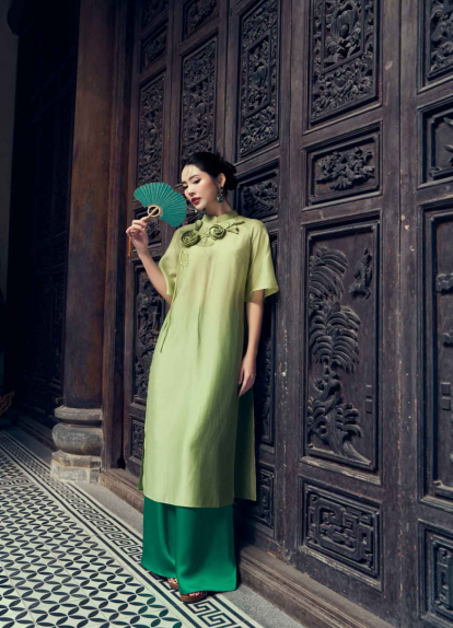 Họa tiết và phụ kiện: có thể chọn thắt lưng lụa nhỏ hoặc chi tiết nhấn eo nhẹ nhàng để làm nổi bật vòng eo mà không gây gò bó. Nếu thích phong cách hiện đại, bạn có thể chọn áo dài cách tân với phần tà xẻ cao vừa phải, phối cùng quần ống suông hoặc chân váy dài cùng màu.